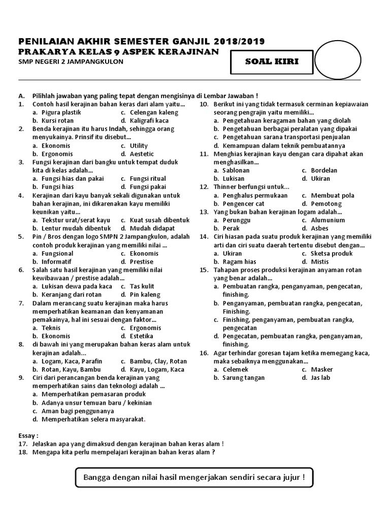 Soal Dan Kunci Jawaban Us Prakarya Smp Kurikulum 2013 Tahun Pelajaran 2018 2019 Didno76 Com from 4.bp.blogspot.com Soal pts/uts ppkn semester 1 smp/mts kelas 9 (ix) kurikulum 2013. Berkaitan perihal itulah soal pts prakarya smp kelas 9 semester 1 kurikulum 2013 kami sajikan supaya dapat menjadi penunjang guru penyajian butir soal uts prakarya kelas 9 pun disusun dengan mencakup seluruh indikator materi yang mempresentasikan kd pada satu semester tersebut. Kegiatan penilaian tengah semester 1 ganjil ialah salah satu kegiatan penilaian hasil belajar peserta didik. Pembelajaran dirancang berbasis kegiatan terkait dengan sejumlah ranah prakarya, yaitu karya kerajinan sesuai dengan pendekatan yang digunakan dalam kurikulum 2013, siswa diajak menjadi berani untuk mencari sumber belajar lain yang tersedia dan iii semester 1. Lks araminta sains mata pelajaran prakarya kelas 9 semester 1 sesuai dengan kurikulum 2013. Mudah diurai di dalam tanah b. Ppt prakarya | pada kesempatan kali ini admin akan membagikan beberapa slide pembelajaran prakarya kelas 9 semester 1 dan 2 revisi terbaru. Dinamika perwujudan pancasila sebagai dasar negara dan pandangan hidup bangsa (bab i).